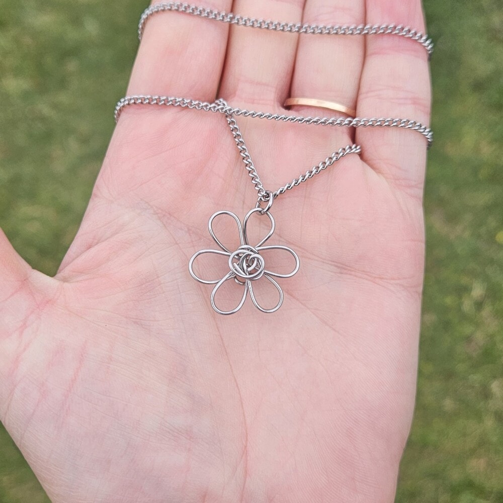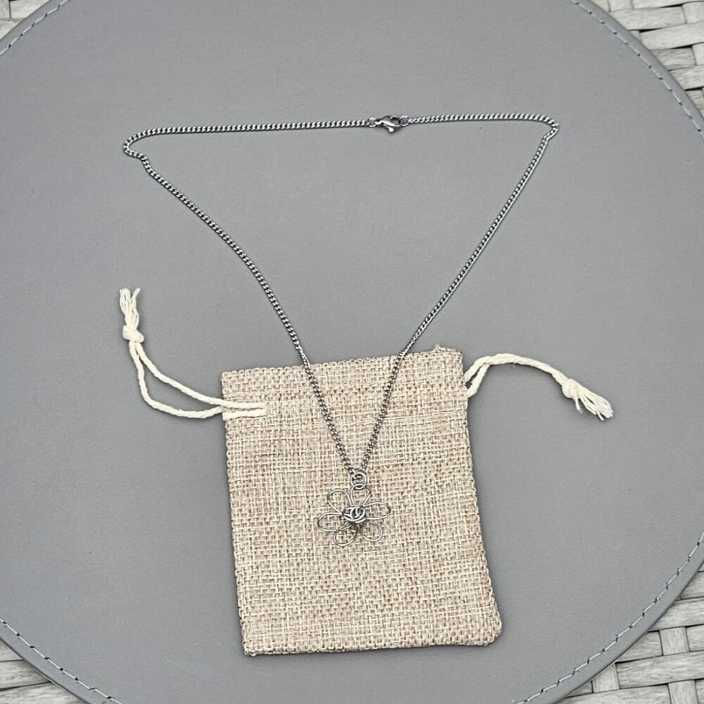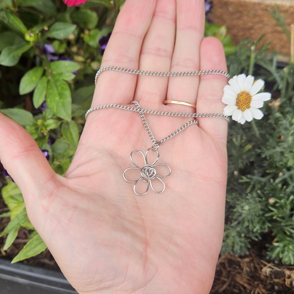 Discover our exquisite silver daisy flower pendant necklace, meticulously handcrafted from 0.8mm, 314 grade stainless steel wire. The pendant showcases a stunning 3D daisy shape, measuring 2cm by 2cm, and includes an 18-inch 304 grade stainless steel chain for a complete look.