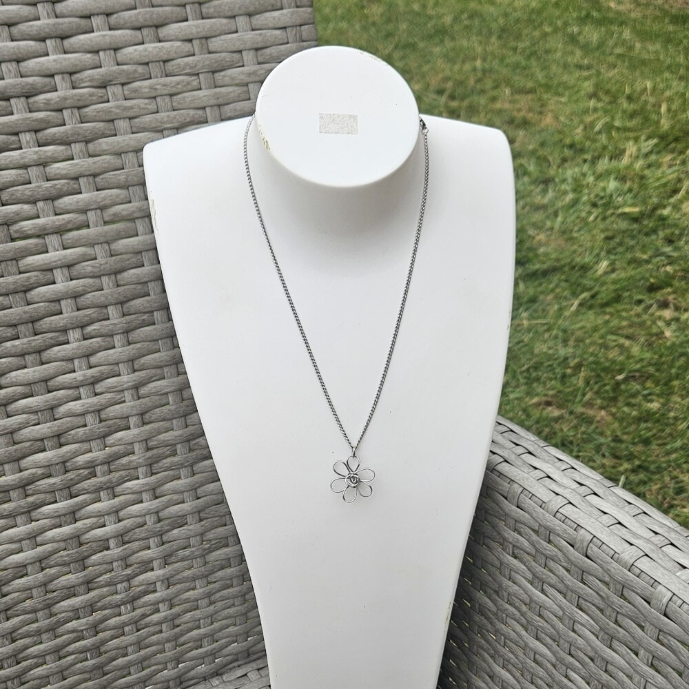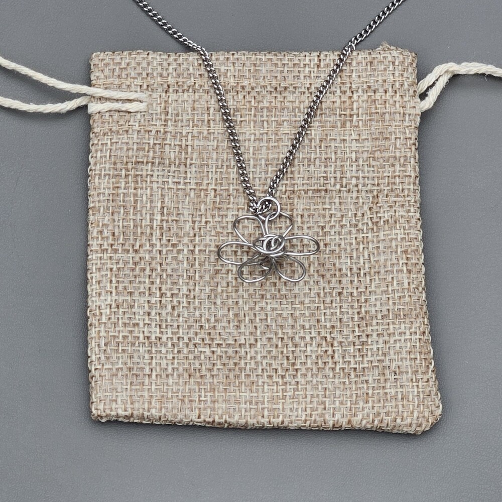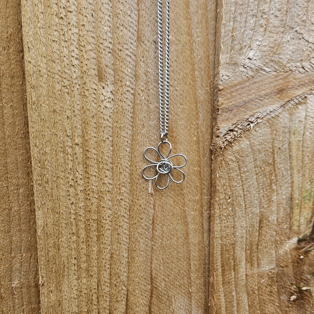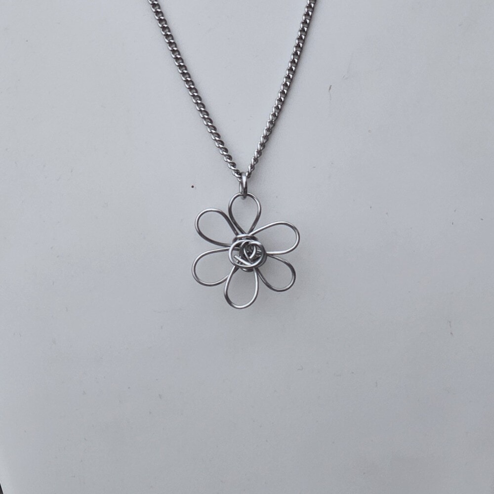 Discover our exquisite silver daisy flower pendant necklace, meticulously handcrafted from 0.8mm, 314 grade stainless steel wire. The pendant showcases a stunning 3D daisy shape, measuring 2cm by 2cm, and includes an 18-inch 304 grade stainless steel chain for a complete look.