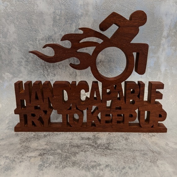 Add a touch of inspiration to your home or office with our Handicapable Try to Keep Up Mahogany Wood Inspirational Quote Plaque. Crafted from high-quality mahogany wood, this plaque is meticulously hand-cut using a scrollsaw to ensure precision and attention to detail.