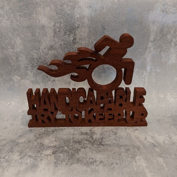 Get inspired with this handcrafted mahogany wood plaque featuring the motivational quote ‘Handicapable try to keep up.’ Hand-cut using a scrollsaw, this unique piece measures 19cm wide, 14cm high, and 1.5cm thick, adding a touch of elegance to any space.
