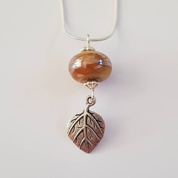 The rich amber and caramel swirls of the artisan-made lampwork bead are inspired by fallen leaves and golden woodland trails. The silver leaf charm adds a rustic woodland feel, evoking the calm of forest walks and the crisp air of seasonal change.