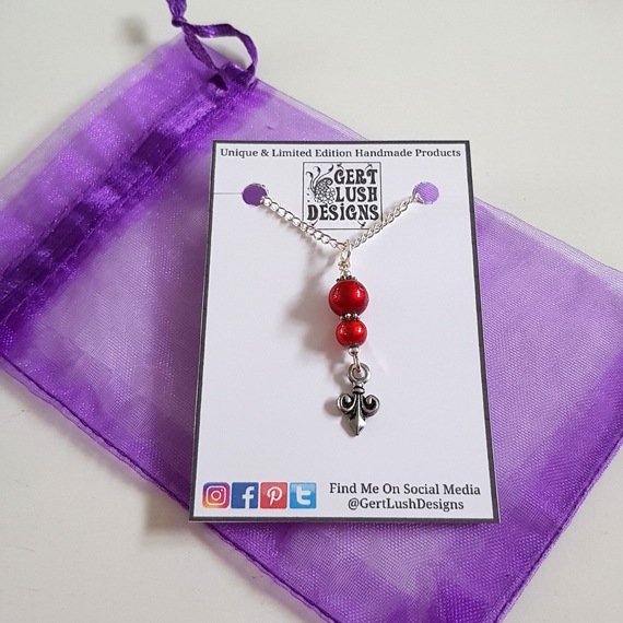 Elegant and eye-catching, this handmade pendant features vibrant red beads and a classic fleur-de-lis charm – a timeless symbol of strength and style. Handmade in the UK and beautifully gift-ready.