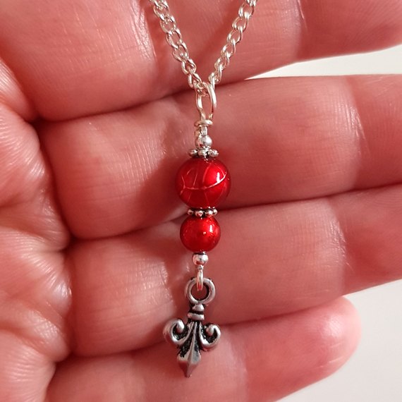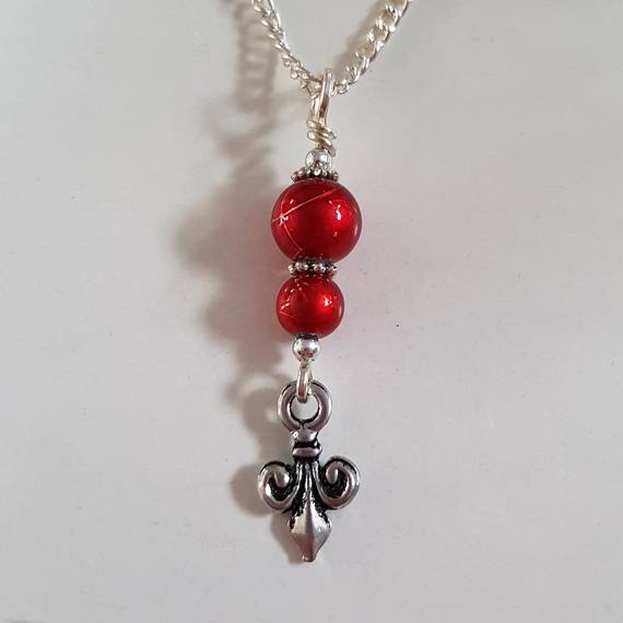 Handmade Beaded Fleur-de-Lis Pendant Necklace – Elegant Symbolic Charm Jewellery – Red and Silver Handmade Gift UK