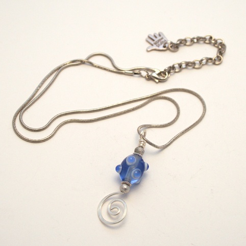 A striking handmade pendant featuring a cobalt blue lampwork bead with raised dots and a hand-twirled silver-plated wire swirl – a unique piece of wearable art.