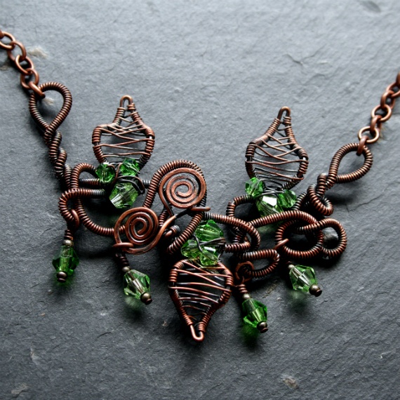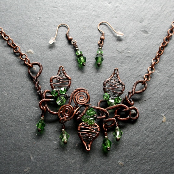Handmade Copper Wirework Chaos Vine Jewellery Set – Necklace & Earrings with Green Crystal Accents