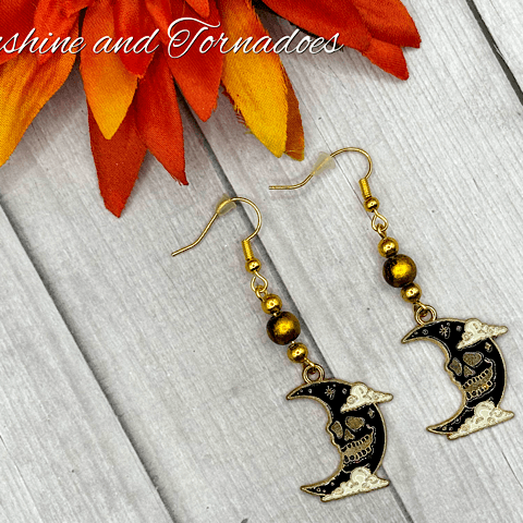 These spooky earrings feature 18k gold filled black enamel moon charms paired with stunning blue and gold glass spray painted beads. They are presented on your choice of hypoallergenic ear wires – please use the drop down menu to select your preference.