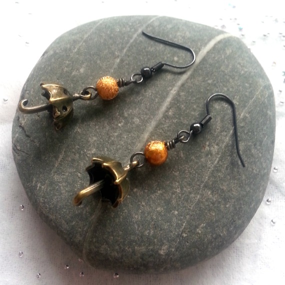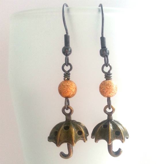 Adorable handmade bronze umbrella drop earrings with golden sparkle beads – a whimsical accessory for rainy day lovers and quirky jewellery fans.