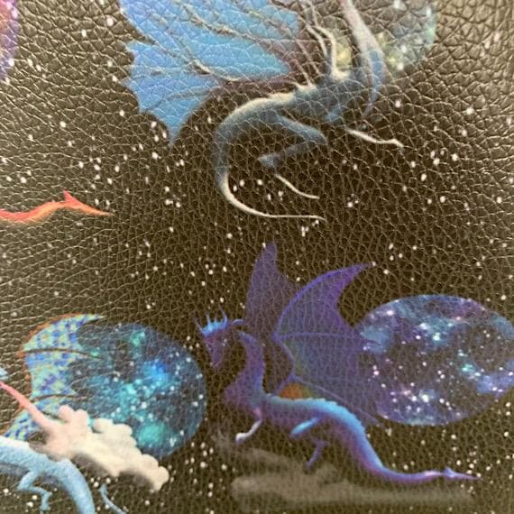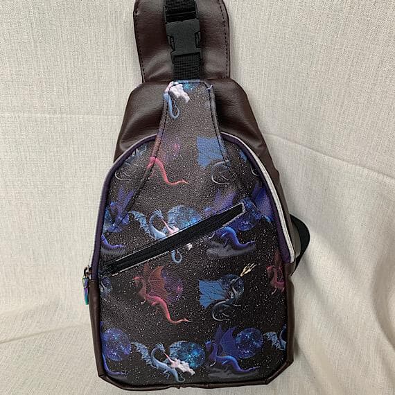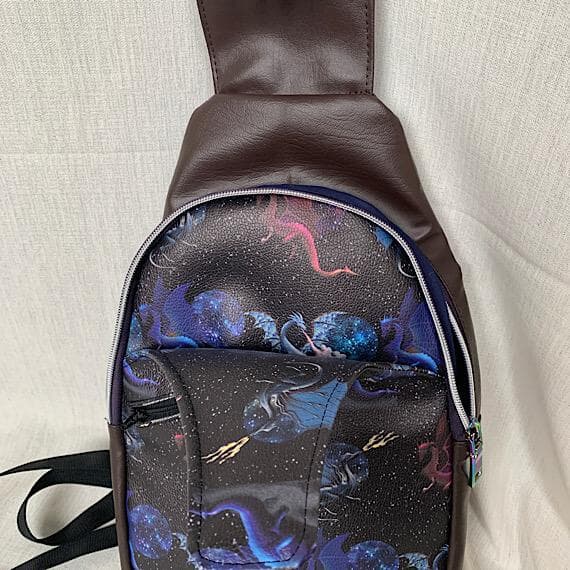 Unique handmade Dragon Vinyl Sling Style Bag with adjustable strap. This one-of-a-kind bag features a front zip pocket, back zip pocket, and multiple storage pockets inside for organization.