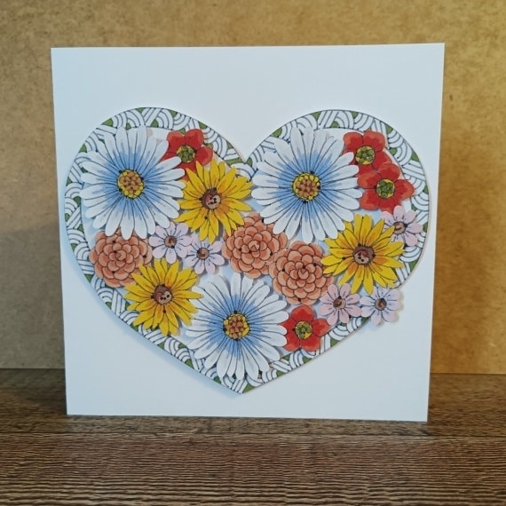 Handmade Embellished 6″ Flower-Filled Heart Card with Pretty Line Border