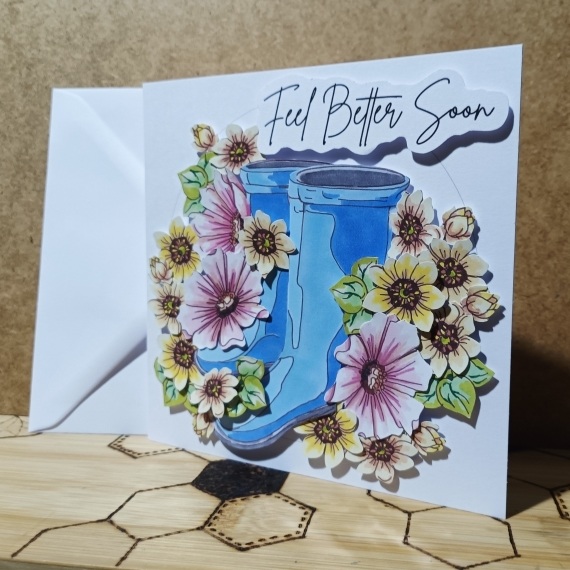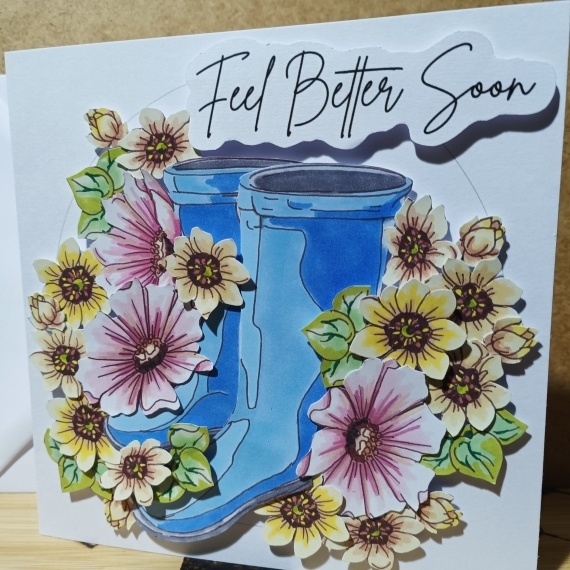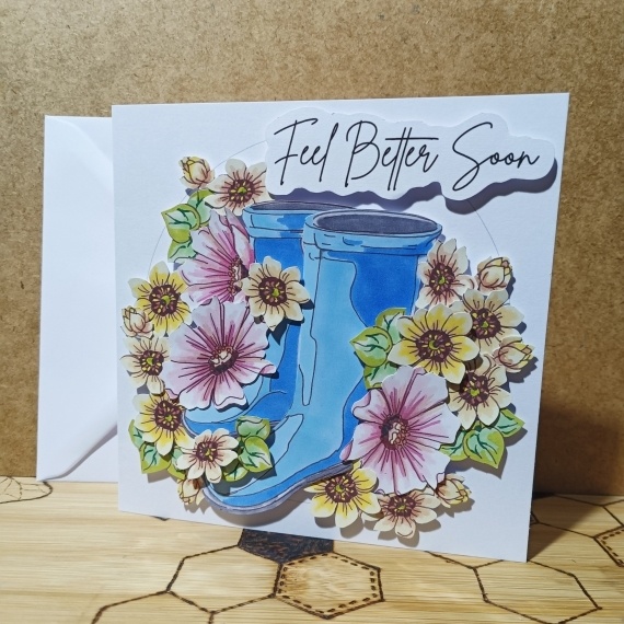 Handmade Feel Better Soon Card with Wellington Boots and Pink/Yellow Blooms