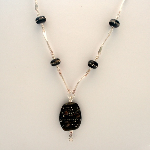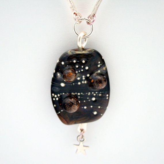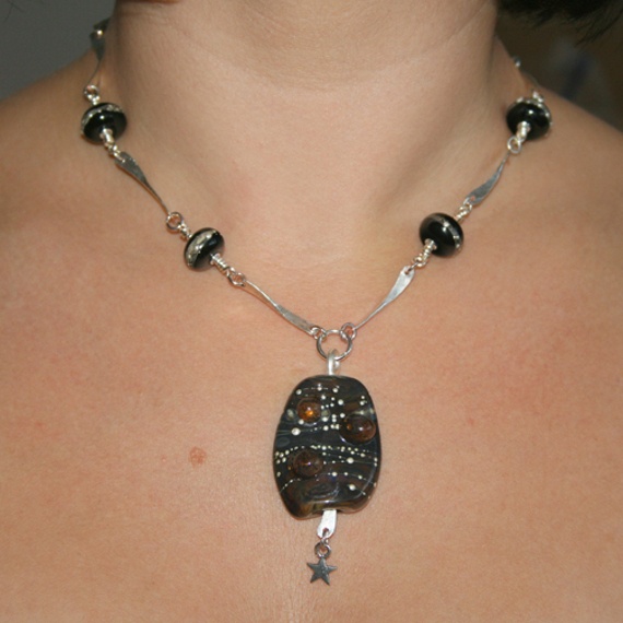 Step into the cosmos with this handmade wirework necklace, inspired by celestial skies and dotted constellations. At the heart of the design is a unique handmade lampwork glass pendant, with swirling tones of deep black, amber, and galaxy-like dots, finished with a tiny silver-tone star charm that dances as you move.