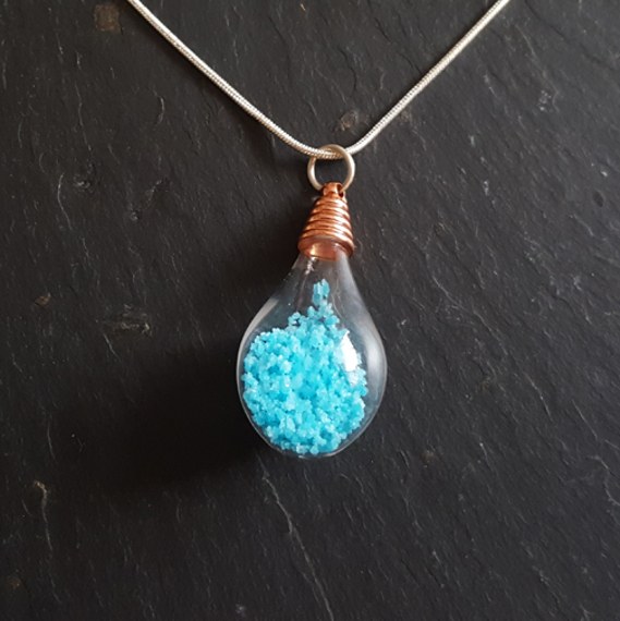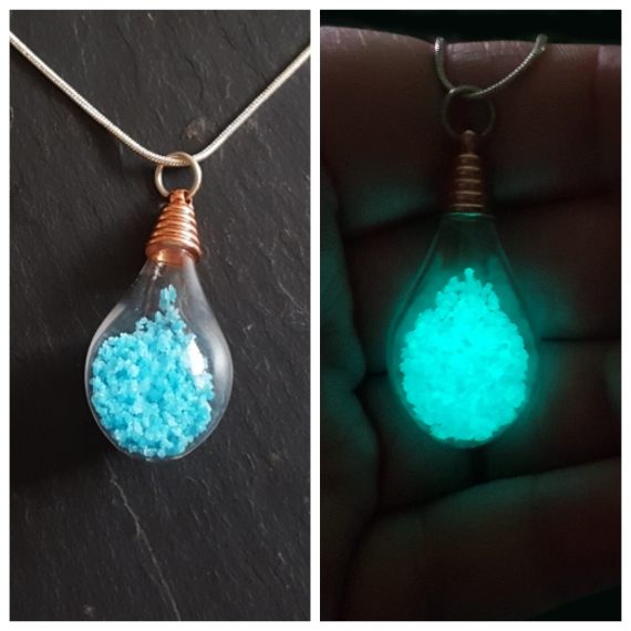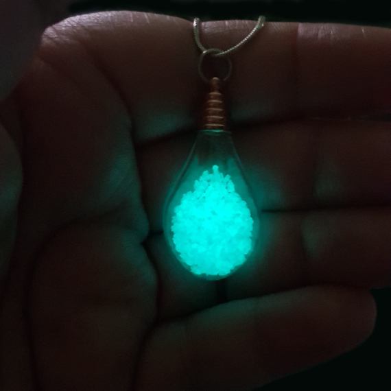 Handmade glow-in-the-dark teardrop pendant filled with turquoise crystals. A mystical, eye-catching accessory that charges in daylight and glows beautifully after dark.