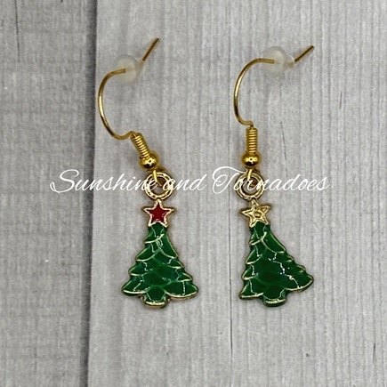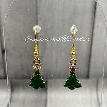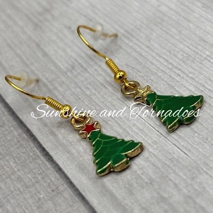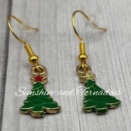 Handmade Gold Filled Enamel Christmas Tree Charm Earrings.