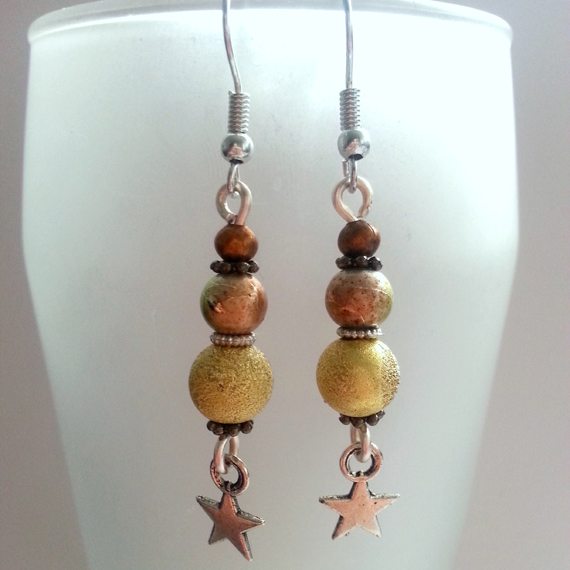 Whimsical handmade earrings featuring earthy green and bronze beads with silver star charms. Lightweight and full of charm – perfect for gifting or daily wear.