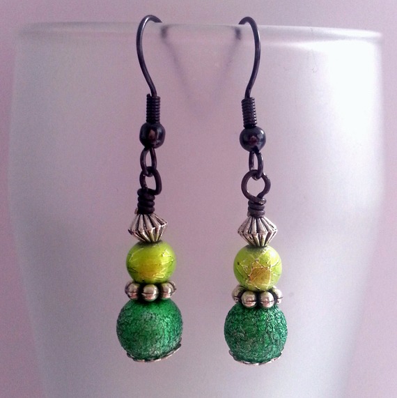 Bold and earthy, these handmade green beaded drop earrings feature textured and crackled glass-look beads with antique silver details – perfect for everyday boho style.