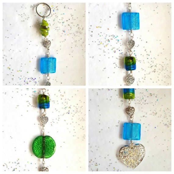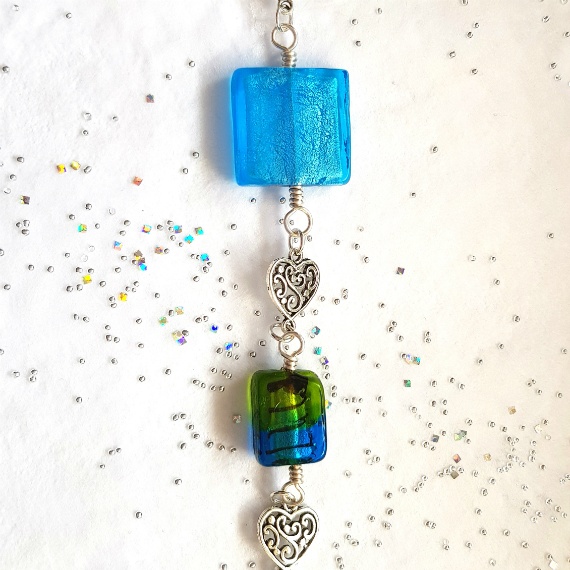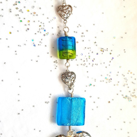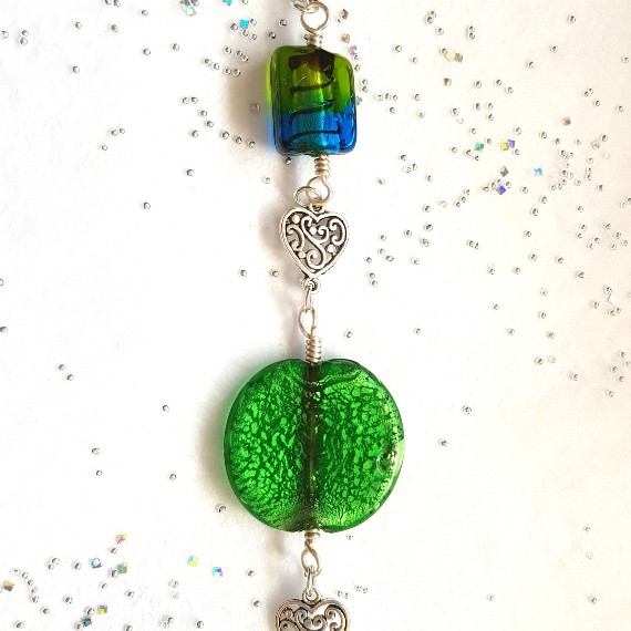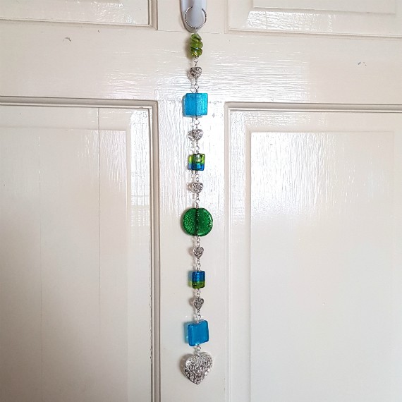 A handmade green and blue beaded hanging ornament with a detailed silver heart charm. Perfect for adding colour and sparkle to your home.