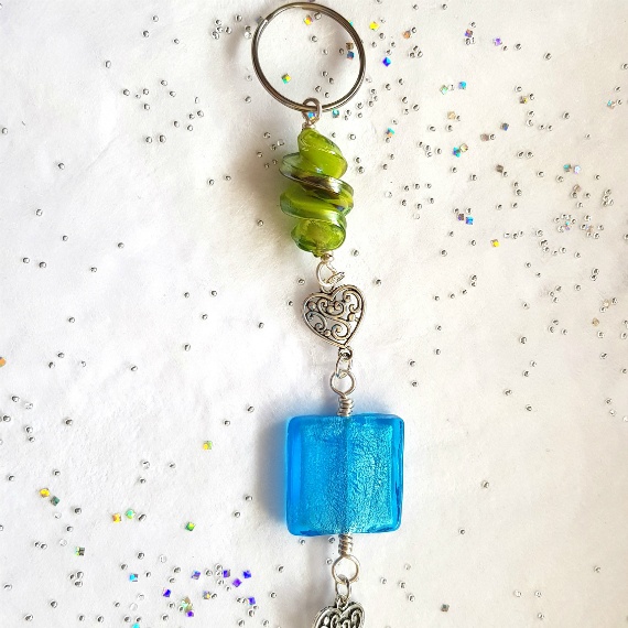 Bring a pop of colour and a touch of elegance to your home with this handmade green and blue beaded hanging ornament. Crafted with a mix of vibrant glass beads in refreshing shades of blue and green, it features a beautifully detailed silver heart charm at the base for a stylish finish.