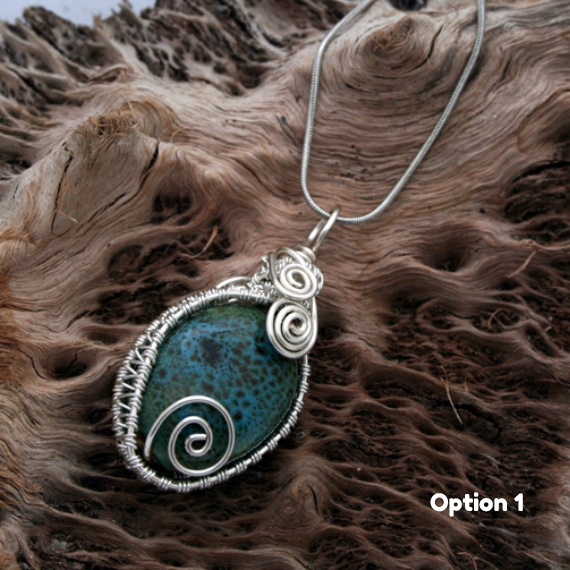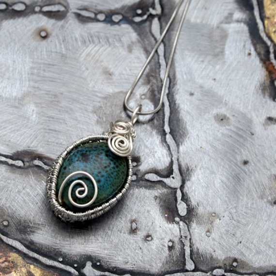 A unique handmade pendant featuring a green glazed ceramic bead, lovingly wrapped in intricate silver wirework. A statement piece of wearable art, perfect for earthy souls and lovers of boho style.