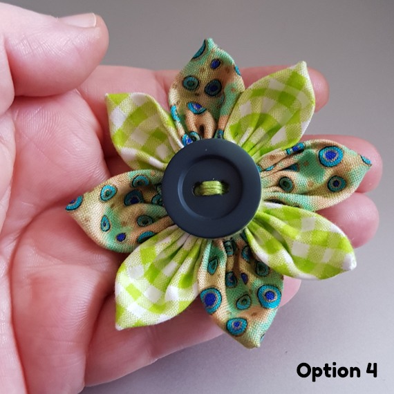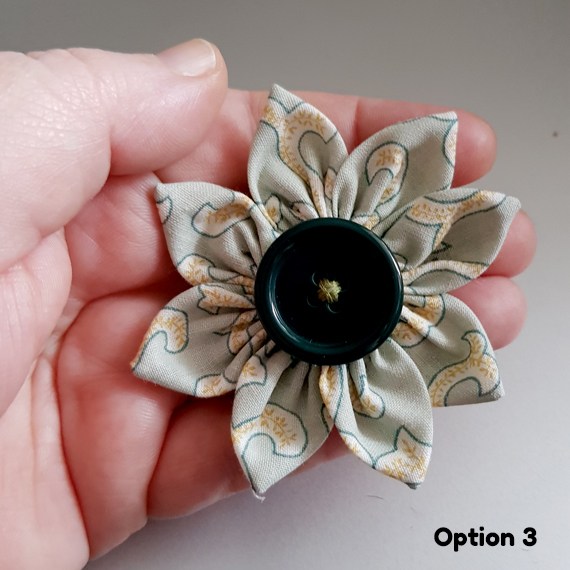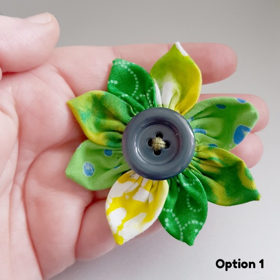 Handmade green fabric flower brooch with a button centre. A cheerful accessory to brighten jackets, scarves, hats, or handbags.