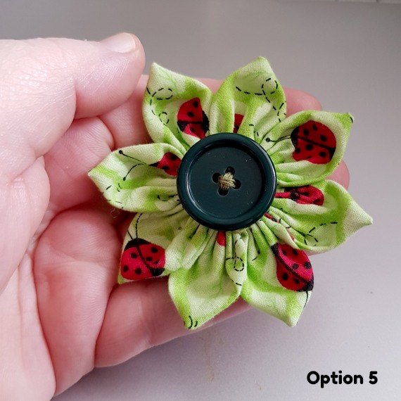 Bring a splash of colour and handmade charm to your wardrobe with this green fabric flower brooch, finished with a button centre. Each brooch is carefully crafted from patterned fabric, making it completely unique and full of character.