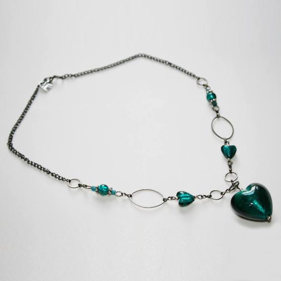 Make a statement with this handmade wirework necklace, designed around a rich, emerald-green foil-lined glass heart that gleams with depth and light. The necklace is accented with smaller matching hearts and glass beads, hand-linked with gunmetal wire and oval connectors for an artisan finish.