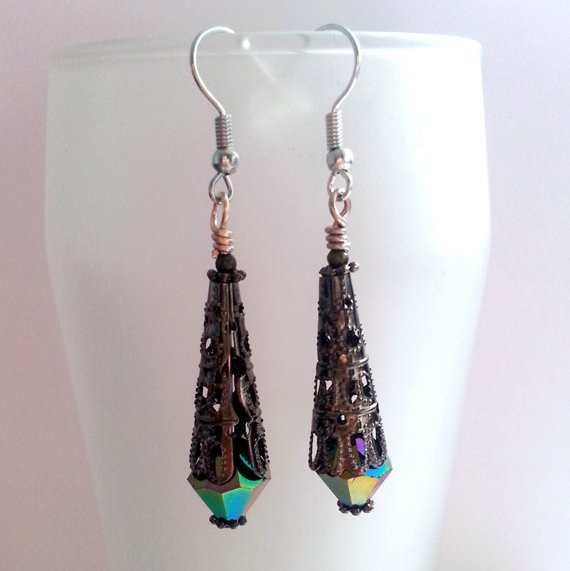 Step into gothic glamour with these Handmade Gunmetal Filigree Dangly Drop Earrings with Rainbow Crystals. Each earring features an ornate, lace-like gunmetal cone that encases a faceted crystal bead shimmering in hues of purple, gold, green, and blue—depending on how the light catches them.