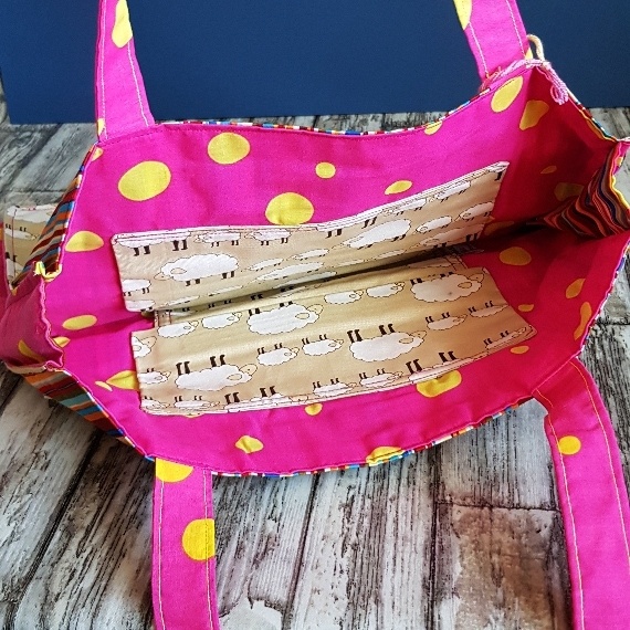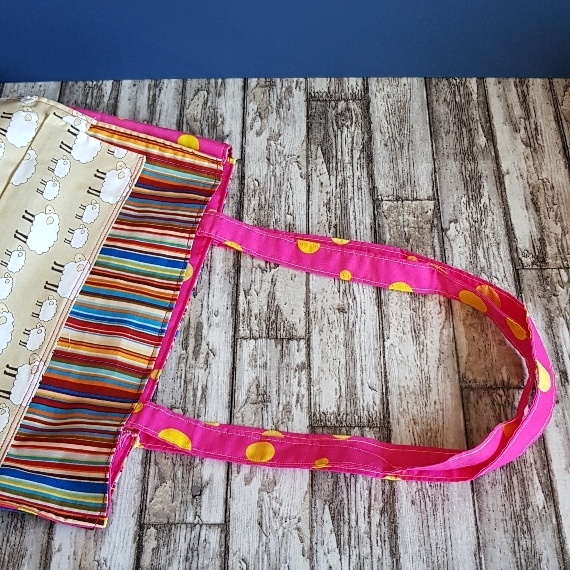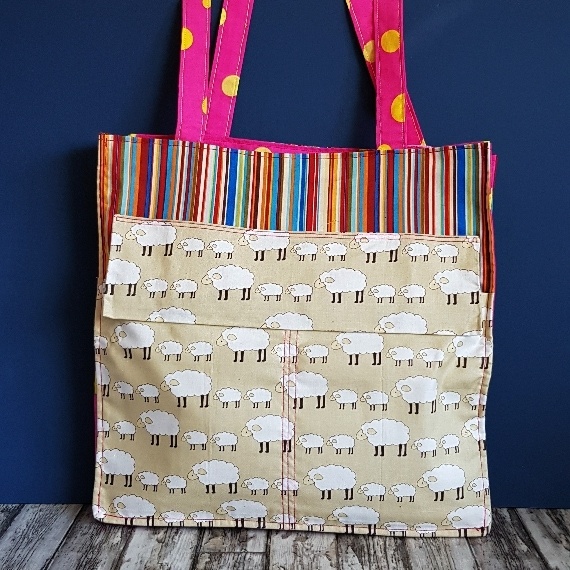 Stand out with this fun and functional tote bag featuring cute sheep, colourful stripes, and bold polka dots. Handmade by Gert Lush Designs, it’s perfect for everyday essentials with personality.