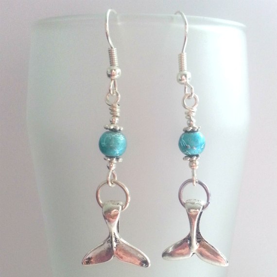 Bring a touch of the sea to your everyday style with these Handmade Mermaid Tail Drop Earrings. Crafted with silver-tone whale tail charms and paired with shimmering turquoise beads, these earrings offer a magical, nautical charm.