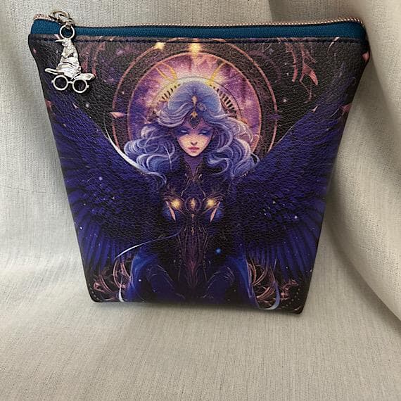 Embrace magic with our handmade vinyl pouch featuring a mystical lady design and a wizard hat zip pull. This enchanting pouch is perfect for storing your essentials in style.