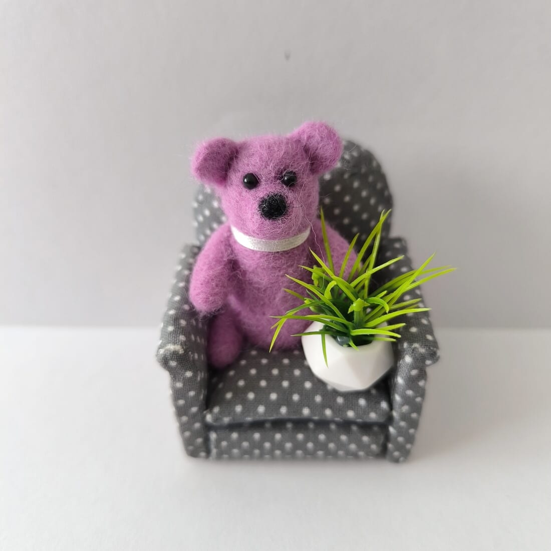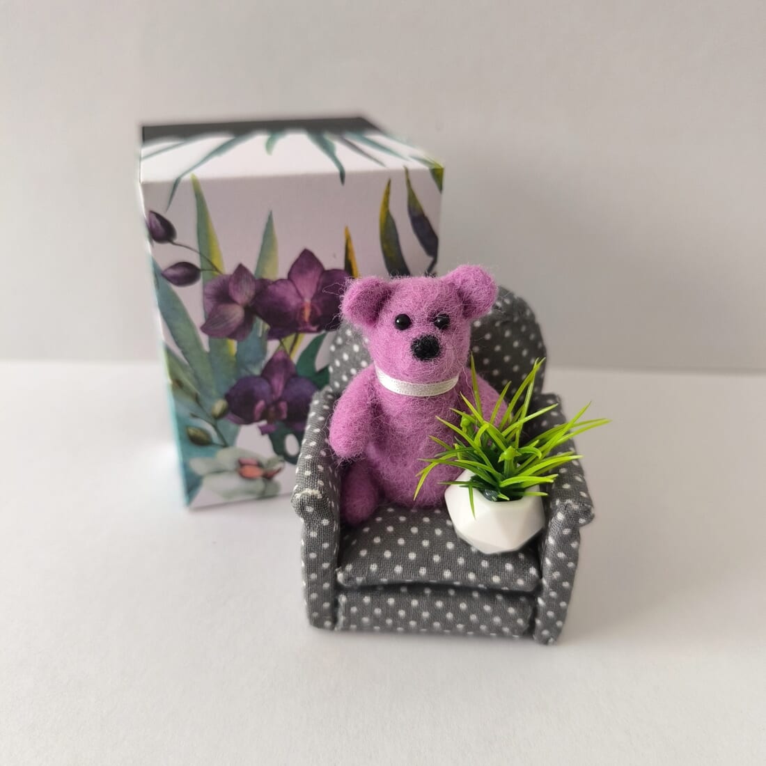 Whether you’re a bear enthusiast, a lover of handmade crafts, or simply looking for a special gift, this needle felted bear in a chair with a plant embellishment is a one-of-a-kind treasure that will brighten up your day.