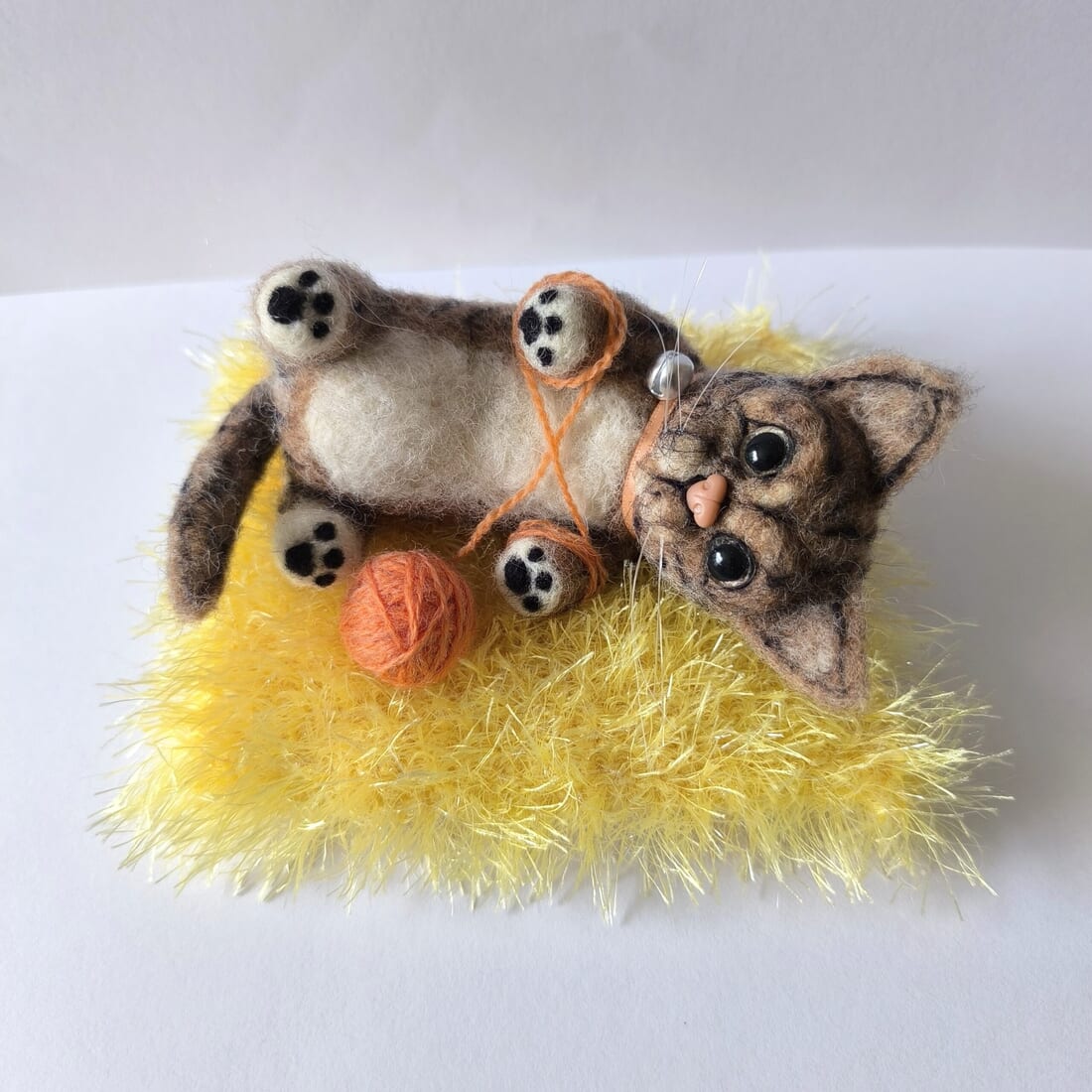Indulge in the delightful world of handmade crafts with our needle felted cat figurine. Crafted with precision and care, this charming cat is captured in a playful moment, swatting at a ball of wool on a soft, hand-knitted blanket.