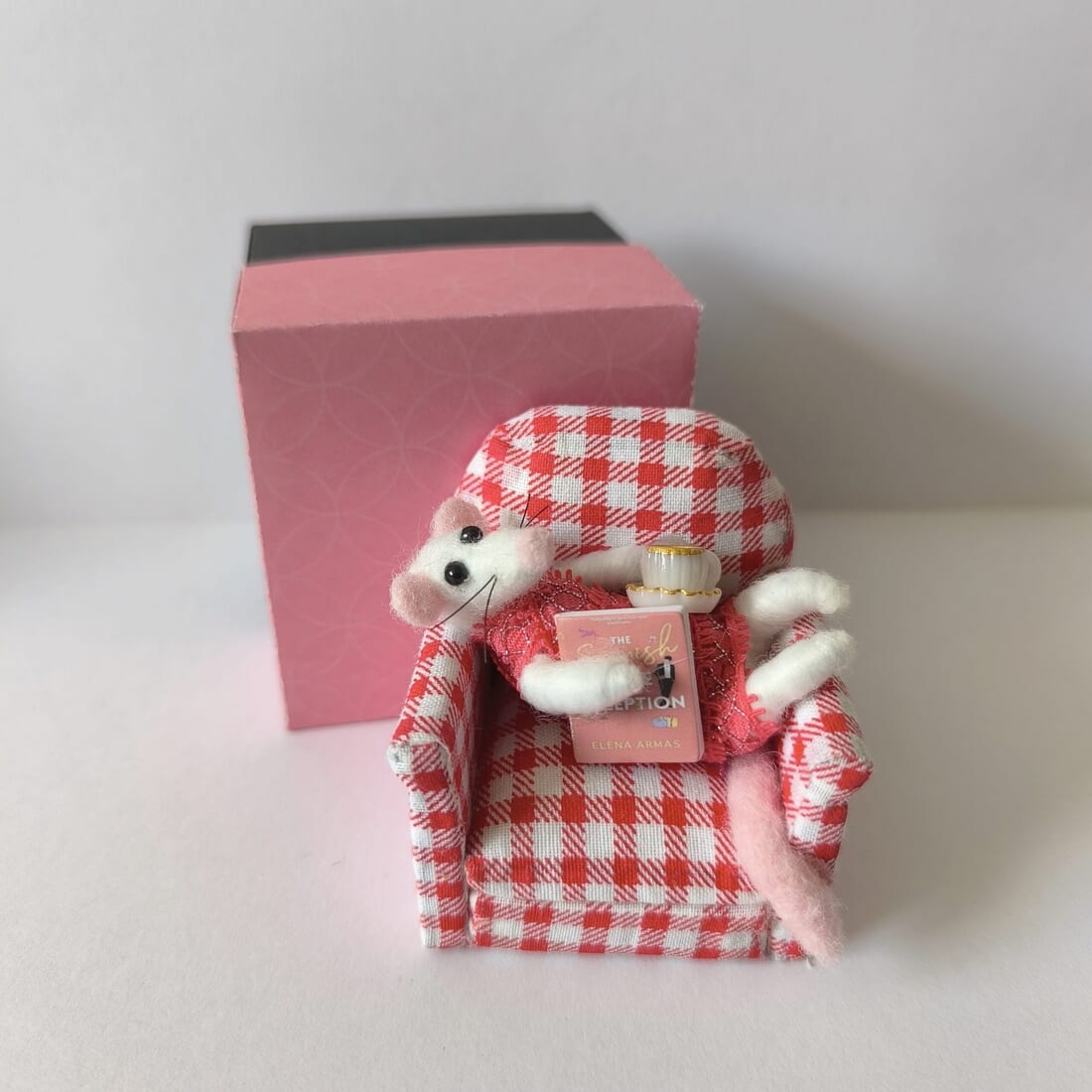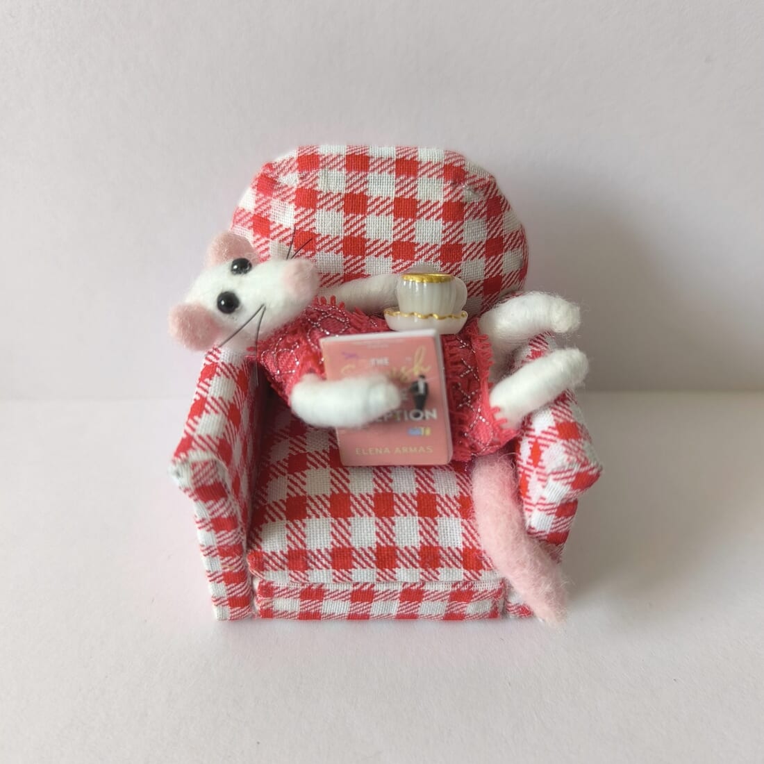 Indulge in the delightful world of needle felting with this charming creation. The needle felted mouse exudes personality and craftsmanship, adding a touch of whimsy to any room. Nestled in a meticulously crafted checkered chair, this piece is a testament to artistry and attention to detail.
