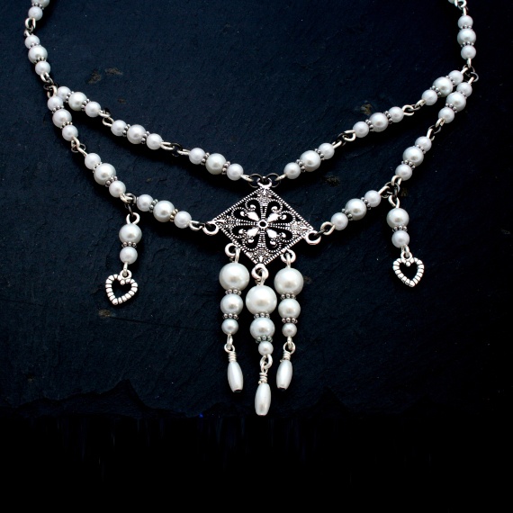 Materials: Faux pearls, silver-plated wire and findings, heart charms
