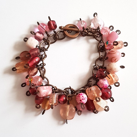 Handmade Pink and Blush Beaded Charm Bracelet – Copper Wire Wrapped, One of a Kind