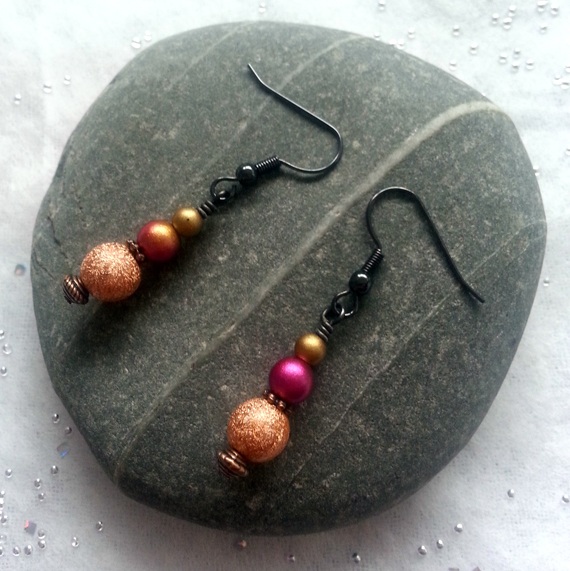 Chic and sparkly handmade dangly earrings featuring pink, peach and gold beads, with a touch of metallic charm. Lightweight, fun, and full of character!