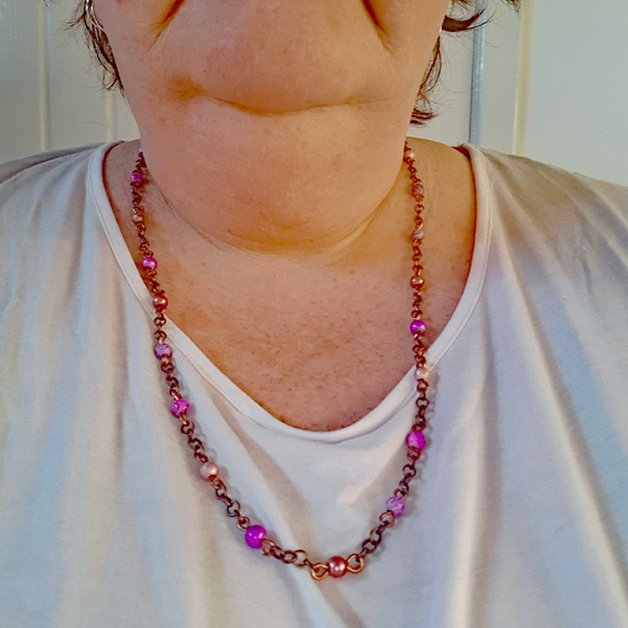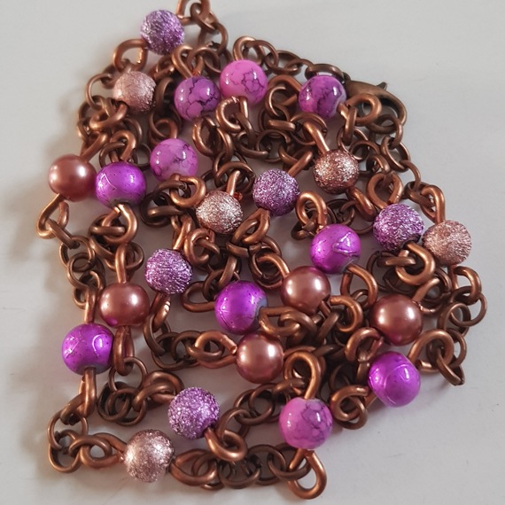 Materials: Glass beads, pearl-effect beads, copper wire, copper-plated chain