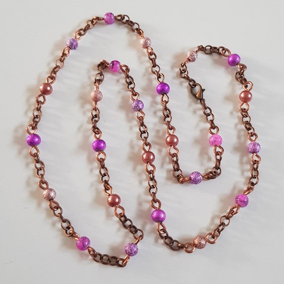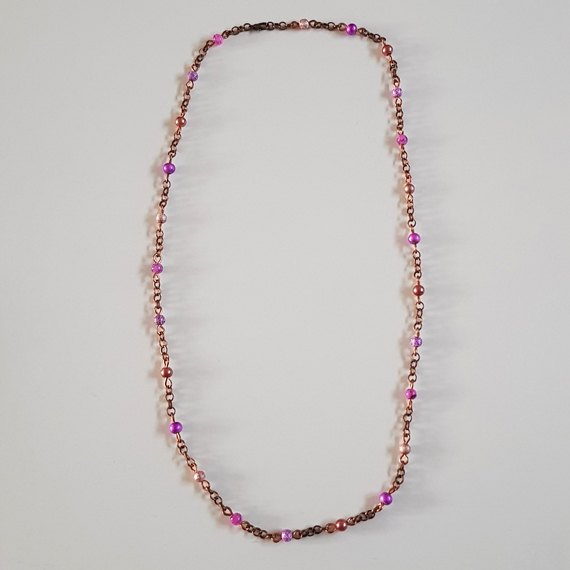 A handcrafted necklace featuring a beautiful blend of pink and peach beads on a rich copper chain – soft, feminine, and full of vintage-style charm.