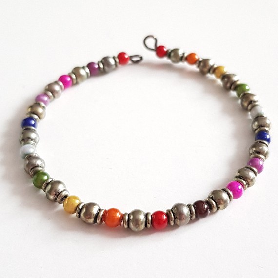 A vibrant handmade cuff bracelet featuring glowing rainbow-coloured miracle beads and antique silver spacers — playful, bold, and full of charm.
