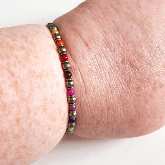 Celebrate colour and creativity with this joyful handmade rainbow cuff bracelet. Made with shimmering miracle beads in every colour of the rainbow, this piece offers an eye-catching glow that shifts beautifully in the light. Each colourful bead is paired with antique silver-tone spacers for contrast and balance, giving the bracelet both playfulness and polish.