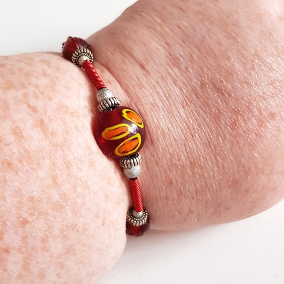 The semi-rigid memory wire cuff creates a secure and comfortable fit that hugs the wrist while offering flexibility and durability. The central bead’s warm, fiery palette brings a burst of colour to your look, making this piece ideal for everyday wear or bold occasion styling.