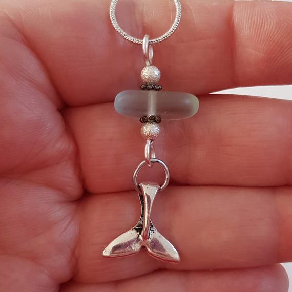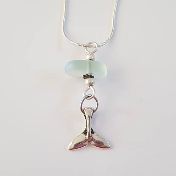 Channel your inner sea spirit with this handmade sea glass pendant, featuring a silver-tone mermaid or whale tail charm. A magical gift for ocean lovers and fans of handcrafted coastal jewellery.
