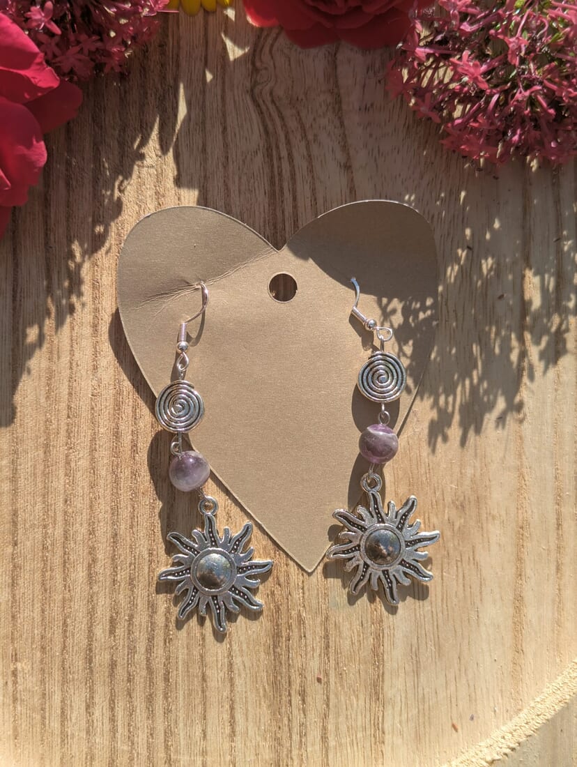 Add a touch of elegance to your outfit with these Handmade Silver Earrings. Crafted with care, these earrings showcase a unique sun charm in silver, symbolizing positivity and radiance. The delicate purple beads add a pop of color and sophistication to your ensemble.