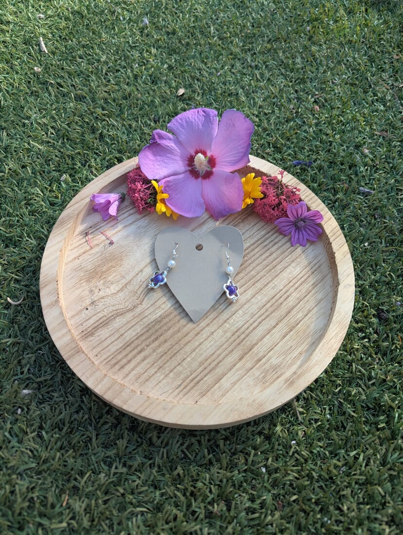 Indulge in the beauty of these Handmade Silver Flower and Purple Bead Earrings. Crafted with precision and care, these earrings feature charming silver flowers adorned with stunning purple beads, creating a captivating design that is sure to turn heads.
