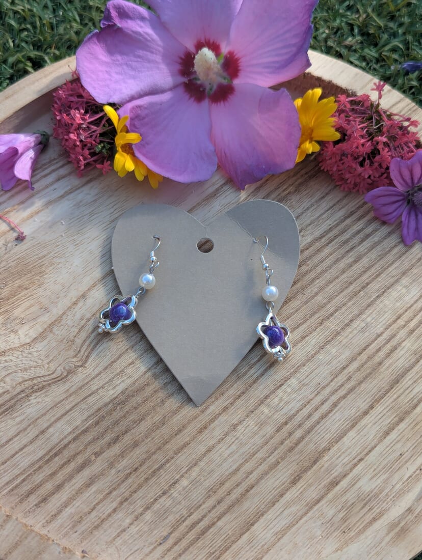 Handmade Silver Flower and Purple Bead Earrings