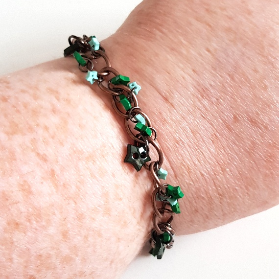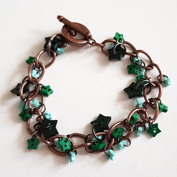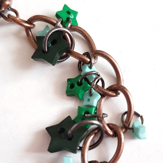 A playful handmade charm bracelet featuring green and teal star buttons on a rustic copper chain — fun, whimsical, and full of character.