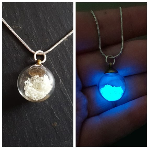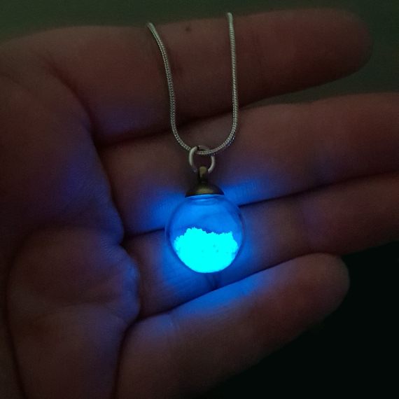 Handmade glow-in-the-dark pendant featuring a petite steampunk orb filled with white crystals that shine bright blue in the dark. A magical and eye-catching accessory that charges in sunlight or UV light.