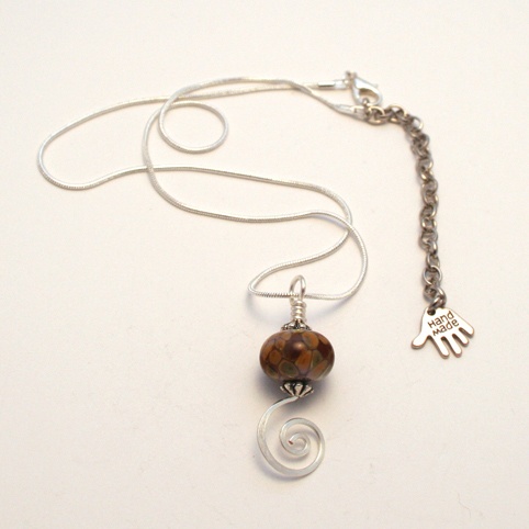 These unique handmade swirl pendant necklaces combine the warmth of nature-inspired colours with elegant wire artistry. Featuring a handcrafted lampwork glass bead in shades of amber, caramel, and deep plum, the pendant has a luxurious organic feel.