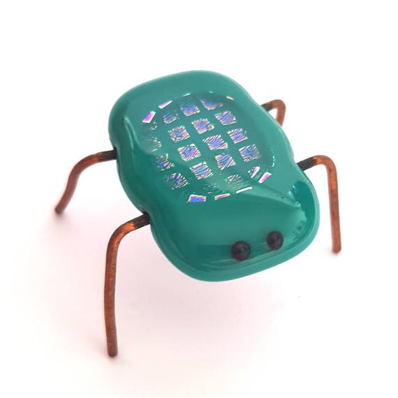 A handmade teal fused glass bug ornament with shimmering detail and copper legs – a unique, playful addition to your home décor. Please note: not suitable for small children.