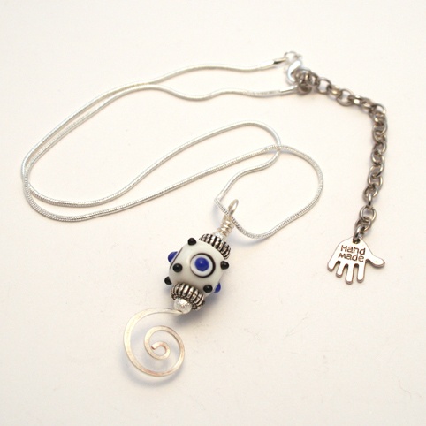 A quirky and eye-catching handmade swirl pendant featuring a playful white and blue lampwork bead and elegant silver wirework.