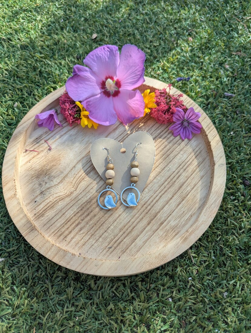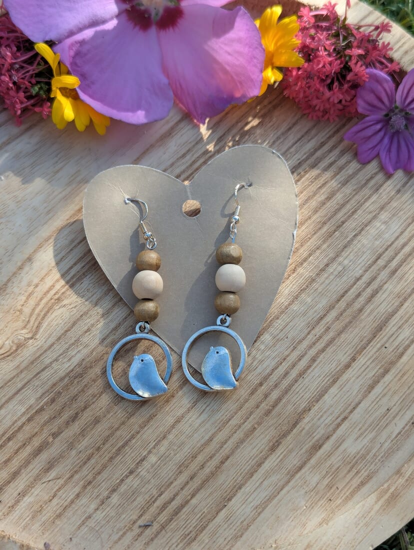 Handmade Wooden Bead and Silver Charm Bird Earrings